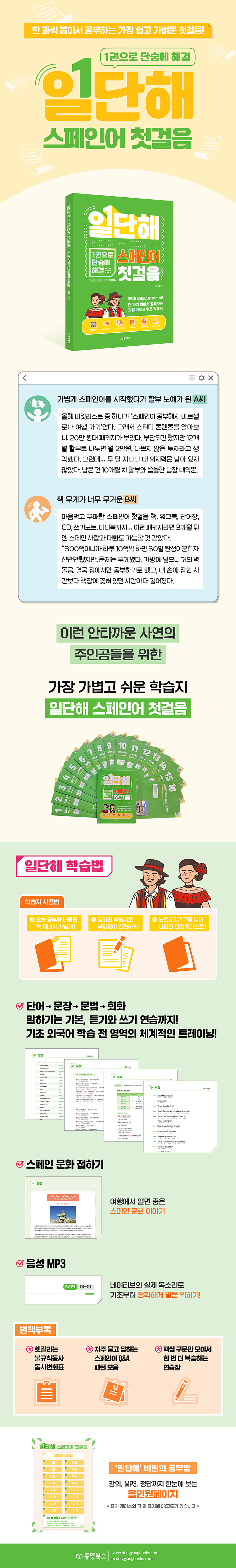 마치 신체의 일부 같은 ‘귀찮음’ 덕에 몇 달 뒤에도 꾸준히 공부하고 있을지 장담 못 하는 우리. 그래서 <일단해 스페인어 첫걸음>은 일단 가볍게 한 걸음 내디딜 수 있게 만들어졌다. ‘스페인어’라는 산을 오르는 첫걸음에 필요 이상으로 짐을 바리바리 챙기면 금방 지친다. 딱 한 권! 알짜배기로 공부한 후에 그다음을 결정한다면 시간과 돈을 이보다 더 효율적으로 쓸 수도 없을 것이다.