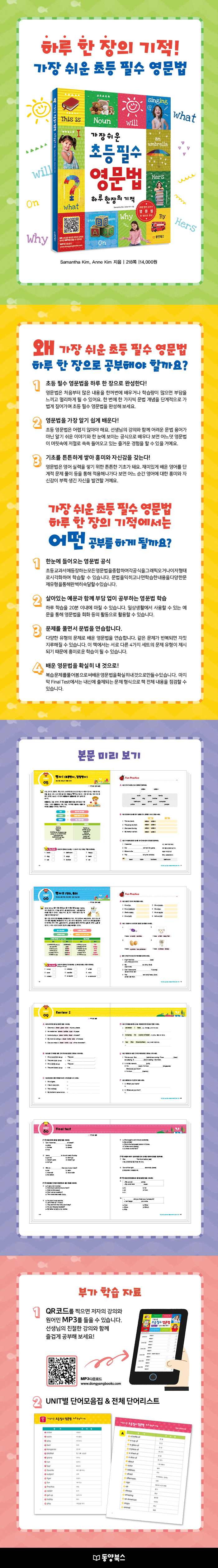 초등교과서에 등장하는 모든 영문법을 종합하여 각 공식을 그래픽 오거나이저 형태로 시각화 했습니다. 수록된 예문들은 초등학생들이 일상생활에서 사용하는 실용적인 문장으로 구성했으며, 문법을 익히고 나면 학습한 내용을 다양한 문제 유형을 통해 완벽히 숙달할 수 있도록 하였습니다.