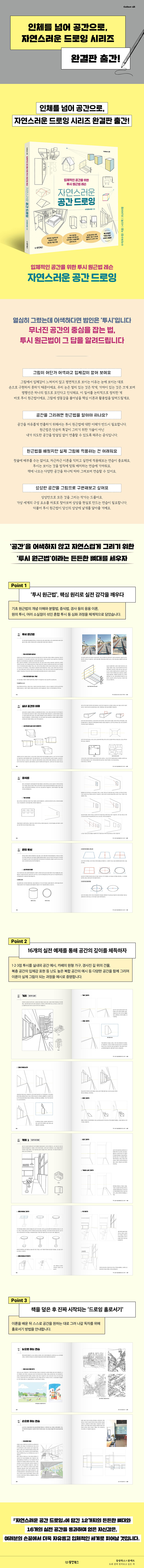 『자연스러운 공간 드로잉』은 내가 서 있는 ‘공간’의 깊이감을 종이 위에 구현하고 싶은 이를 위한 작법서입니다. 투시 원근법 핵심 이론 12가지와 이를 적용한 16개의 실전 예제를 통해 입체적인 공간을 마스터하도록 돕습니다.