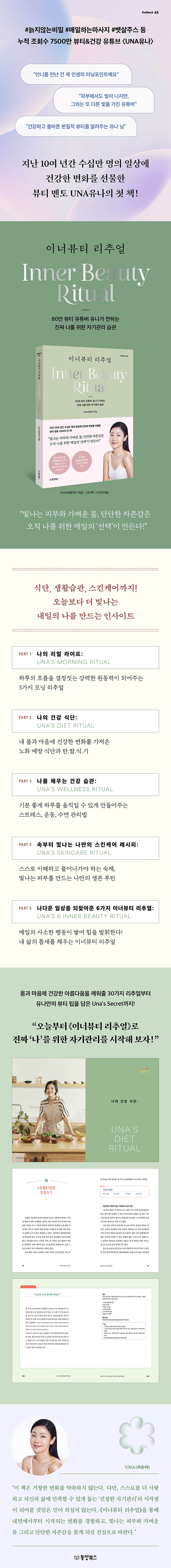 독보적 이너뷰티 크리에이터 UNA유나의 첫 책이 출간되었다. 《이너뷰티 리추얼》은 겉으로 보여지는 단편적인 아름다움을 넘어, 몸과 마음의 건강한 아름다움을 깨우는 지속 가능한 자기관리 습관을 제안한다. 하루의 에너지를 깨우는 모닝 리추얼부터 몸과 마음의 균형을 찾아줄 건강 식단, 운동, 수면, 스트레스 관리까지 일상 전반의 자기관리법을 아우른다. 또한, 빛나는 스킨케어 루틴과 나다운 하루를 만들어줄 생활 원칙도 밀도 있게 담아냈다. 모든 방법은 저자가 직접 실천하며 반복해 온 이너뷰티 루틴으로, 누구나 부담 없이 시작할 수 있다.